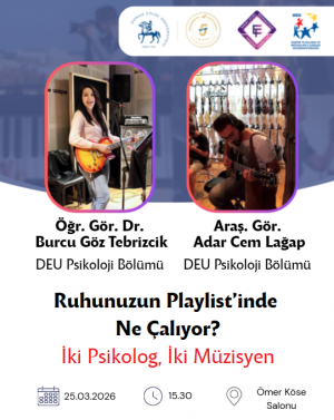 “Ruhunuzun Playlist’inde Ne Çalıyor? İki Psikolog, İki Müzisyen” başlıklı bu panelde, bölümümüz öğretim elemanlarından ve aynı zamanda müzikle ilgilenen Öğr. Gör. Dr. Burcu Göz Tebrizcik ve Araş. Gör. Adar Cem Lağap bizlerle birlikte olacaklar.