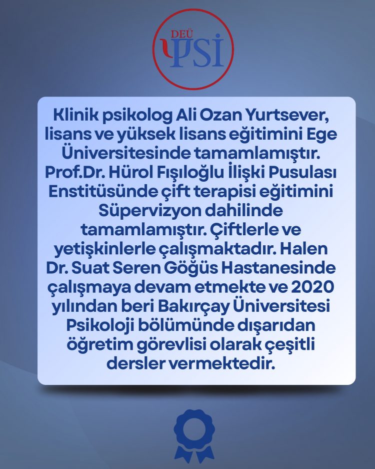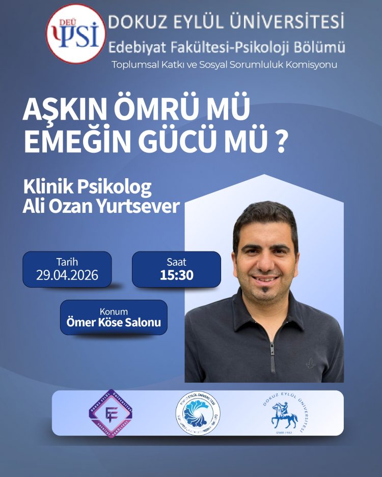 Bölümümüz Toplumsal Katkı ve Sosyal Sorumluluk Komisyonu’nun katkılarıyla, 29 Nisan 2026 Cuma günü, saat 15.30’da Ömer Köse Salonu’nda Klinik Psikolog Ali Ozan Yurtsever bir konuşma yapacaktır. Tüm ilgilileri bekleriz.