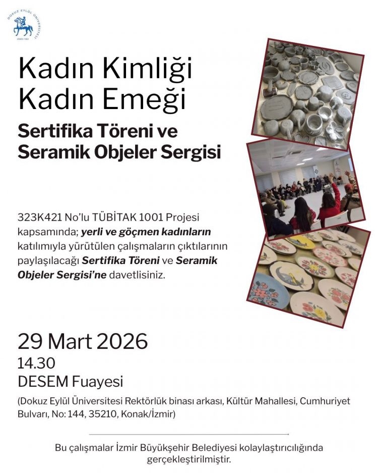 29 Mart 2026 Pazar günü, Dokuz Eylül Üniversitesi “DESEM” binasında, s323K421 No’lu TÜBİTAK 1001 Projesi kapsamında yerli ve göçmen kadınların katılımıyla yürütülen çalışmaların çıktılarının paylaşılacağı “Kadın Kimliği Kadın Emeği” başlıklı sertifika töreni ve seramik objeler sergisi gerçekleştirilecektir.