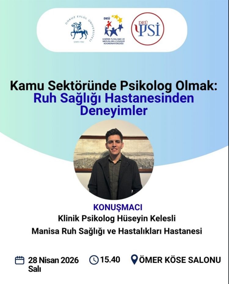 Dokuz Eylül Üniversitesi Psikoloji Bölümü ve Kariyer Planlama ve Mezunlarla İlişkiler Koordinatörlüğü işbirliğiyle, kariyer yolculuğunuza ışık tutacak etkinliklerimize devam ediyoruz.