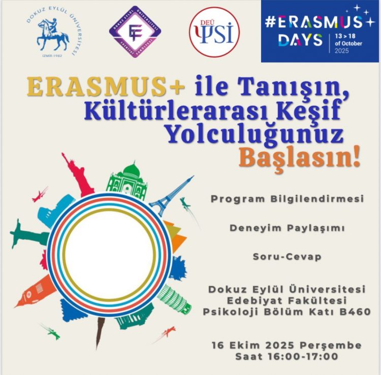 Dokuz Eylül Üniversitesi Edebiyat Fakültesi Psikoloji Bölümü olarak, 13-18 Ekim 2025 tarihleri arasında kutlanan #ErasmusDays etkinlikleri kapsamında öğrencilerimize yönelik bir bilgilendirme toplantısı düzenlenmiştir. “Erasmus+ ile Tanışın, Kültürlerarası Keşif Yolculuğunuz Başlasın” temasıyla gerçekleştirilen etkinlikte; Erasmus+ öğrenim ve staj hareketliliği programlarının işleyişi hakkında teknik bilgilendirme yapılmış, ardından programdan daha önce yararlanmış öğrencilerimiz deneyimlerini paylaşmışlardır. Etkinlik, soru-cevap oturumu ile sona ermiştir.