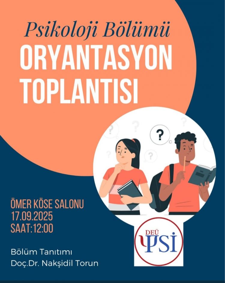 Dokuz Eylül Üniversitesi Psikoloji Bölümü’ne yeni katılan öğrencilerimizin üniversite yaşamına ve akademik süreçlere uyumlarını kolaylaştırmak amacıyla düzenlenen “Oryantasyon Toplantısı”, 17 Eylül 2025 tarihinde gerçekleştirilmiştir. Ömer Köse Salonu’nda saat 12.00’de başlayan etkinlikte, Doç. Dr. Nakşidil Torun tarafından yapılan bölüm tanıtımı ile öğrencilere müfredat, akademik beklentiler ve bölümün sunduğu olanaklar hakkında kapsamlı bilgiler aktarılmıştır. Öğrencilerin sorularının yanıtlanmasıyla devam eden toplantı, yeni akademik yıl için başarı dilekleriyle sona ermiştir.